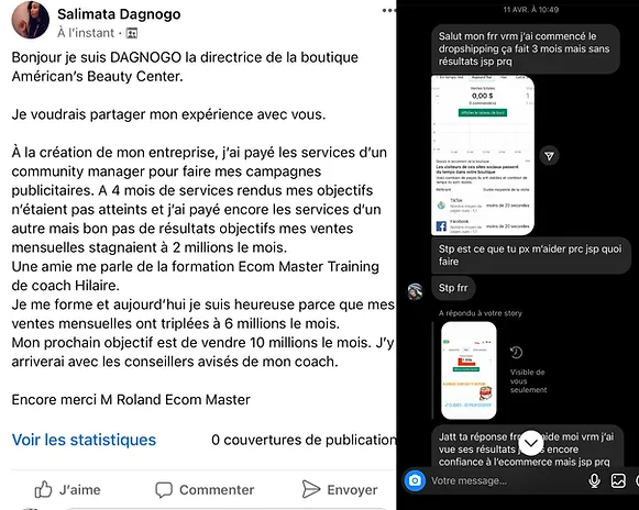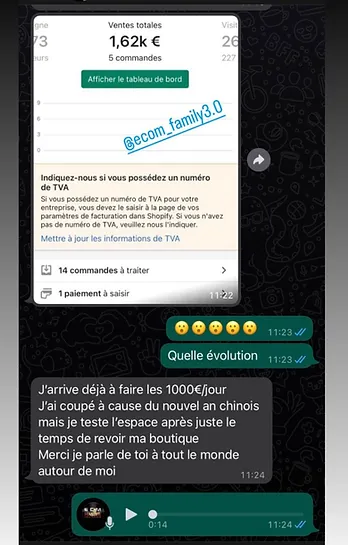 Je proposais mes produits et je n'avais aucune réaction même pendant mes campagnes publicitaires personne ne réagissait et alors j'ai décidé d'éssayer la méthode Ecom Family et la j'ai eu plus d'engagement et plus de vente sur ma boutique